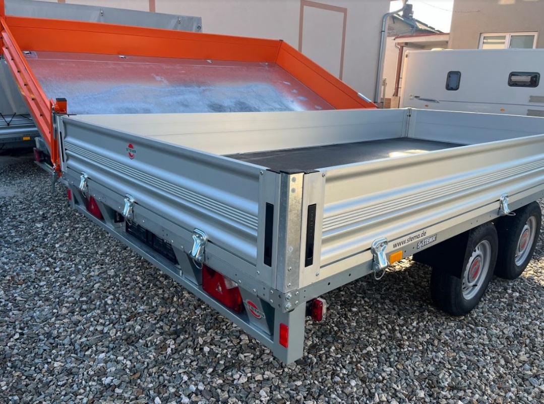 Bržděný dvounápravový profi přívěs valník STEMA s ložnou plochou 401 x 203 cm a celkovou hmotností 2700 kg. Přívěsný vozík s koly pod ložnou plochu.